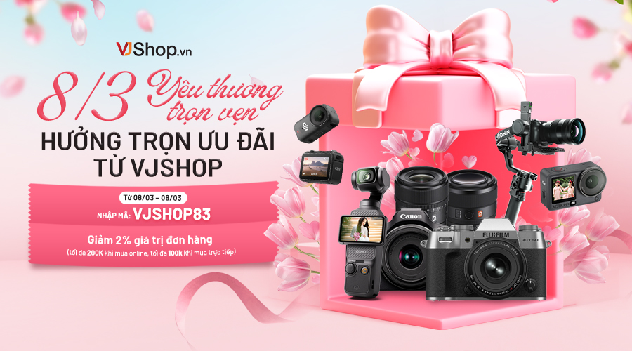 8/3 sắp tới rồi, một dịp rất đẹp để chiều bản thân một chút, nhất là với những bạn nữ đang sống cùng với nhiếp ảnh và sáng tạo nội dung, hoặc là một dịp để phái mạnh có thể trao gửi quà tặng cho người phụ nữ mình yêu thương. VJShop.vn có một chương trình ưu đãi nhỏ nhưng khá dễ thương: giảm 2% giá trị đơn hàng khi nhập mã VJSHOP83. Ưu đãi áp dụng linh hoạt online và tại cửa hàng, giúp hành trình nâng cấp gear trở nên dễ dàng hơn bao giờ hết. 8/3 không chỉ là ngày của hoa và lời chúc, mà còn là ngày để bạn tỏa sáng cùng đam mê.