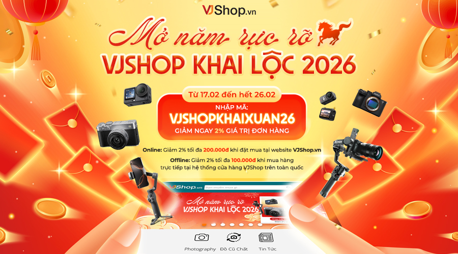 Mùa xuân gõ cửa cũng là lúc khởi đầu cho những dự định mới và nguồn cảm hứng sáng tạo tràn đầy. Hòa chung không khí rộn ràng đầu năm, VJShop.vn hân hành giới thiệu chương trình ưu đãi đặc biệt “VJShop Khai Xuân Rực Rỡ - Săn Deal 2% Đón Năm Mới 2026”, món quà khai xuân dành cho cộng đồng yêu nhiếp ảnh và đam mê công nghệ. Đây không chỉ là dịp mua sắm hấp dẫn, mà còn là cơ hội để bạn sẵn sàng nâng cấp thiết bị, làm mới hành trình sáng tạo và bắt đầu năm 2026 với thật nhiều may mắn, thuận lợi và bứt phá.